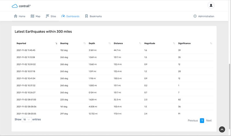 The effects of seismic activity on critical infrastructure and utilities can cause physical and functional damage, increase the risk of failure, or reduce operational performance. Risk management best practices requires operators to promptly conduct post-event inspections and evaluation of vulnerable sites and structures. Now you can track and alert on critical seismic events in Contrail.
